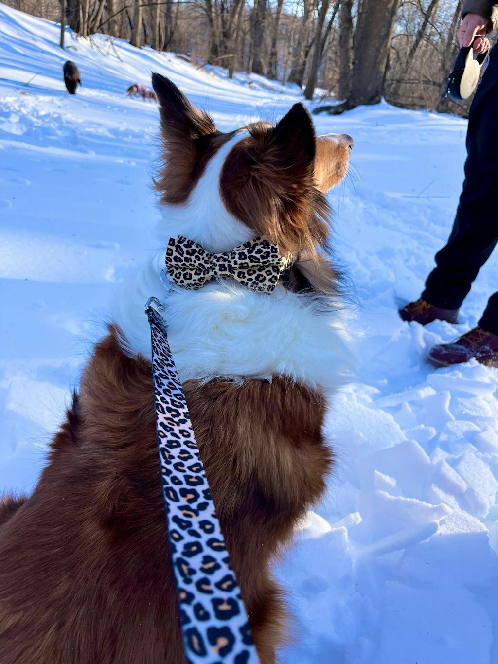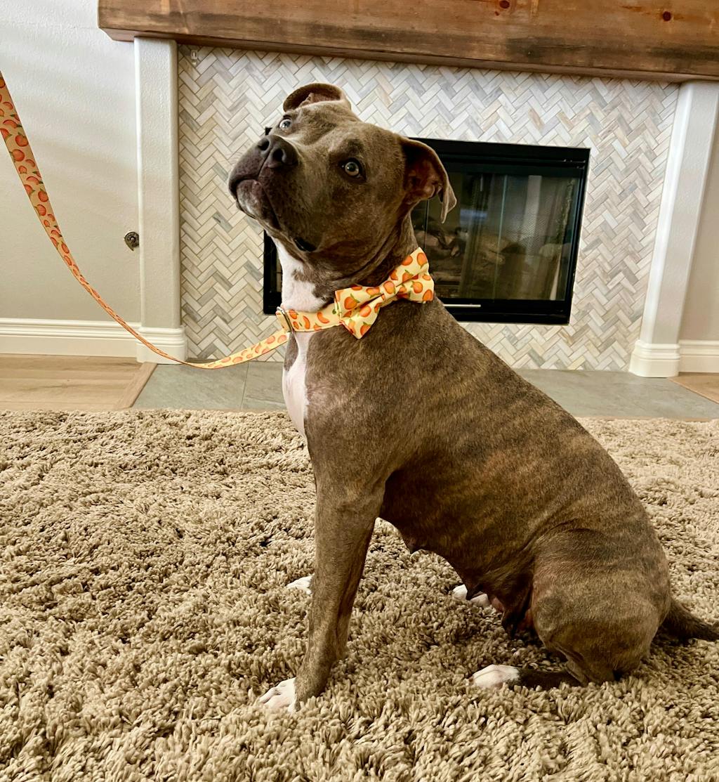 This peach print is super cute! We love the collar and leash. They are both made with great quality and fit, as well as being very cute on Winnie.