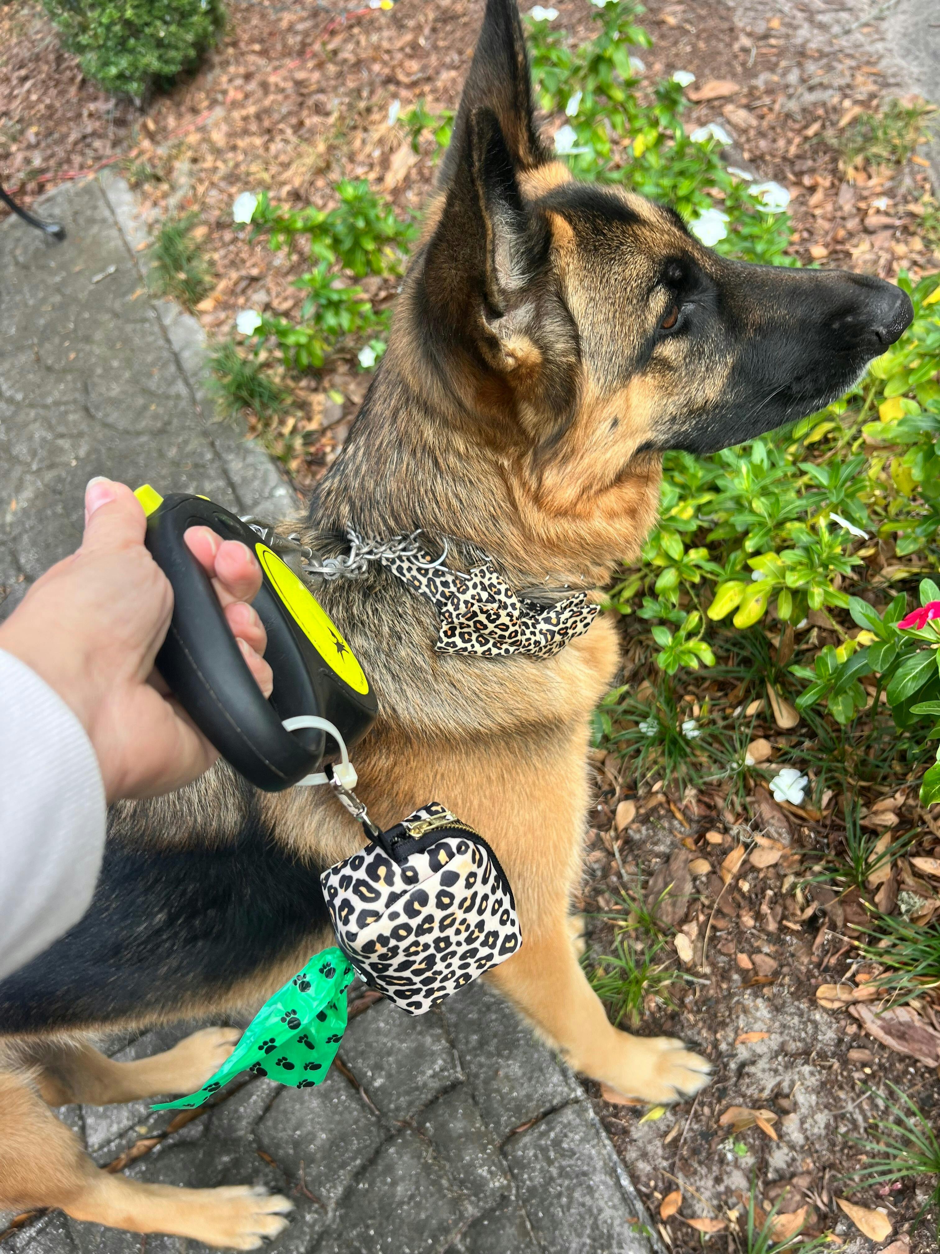 Pros: Fabric is able to be wiped off/cleaned. It doesn’t bang against my leash handle when walking since it is soft. Fits two bag rolls. Stylish.