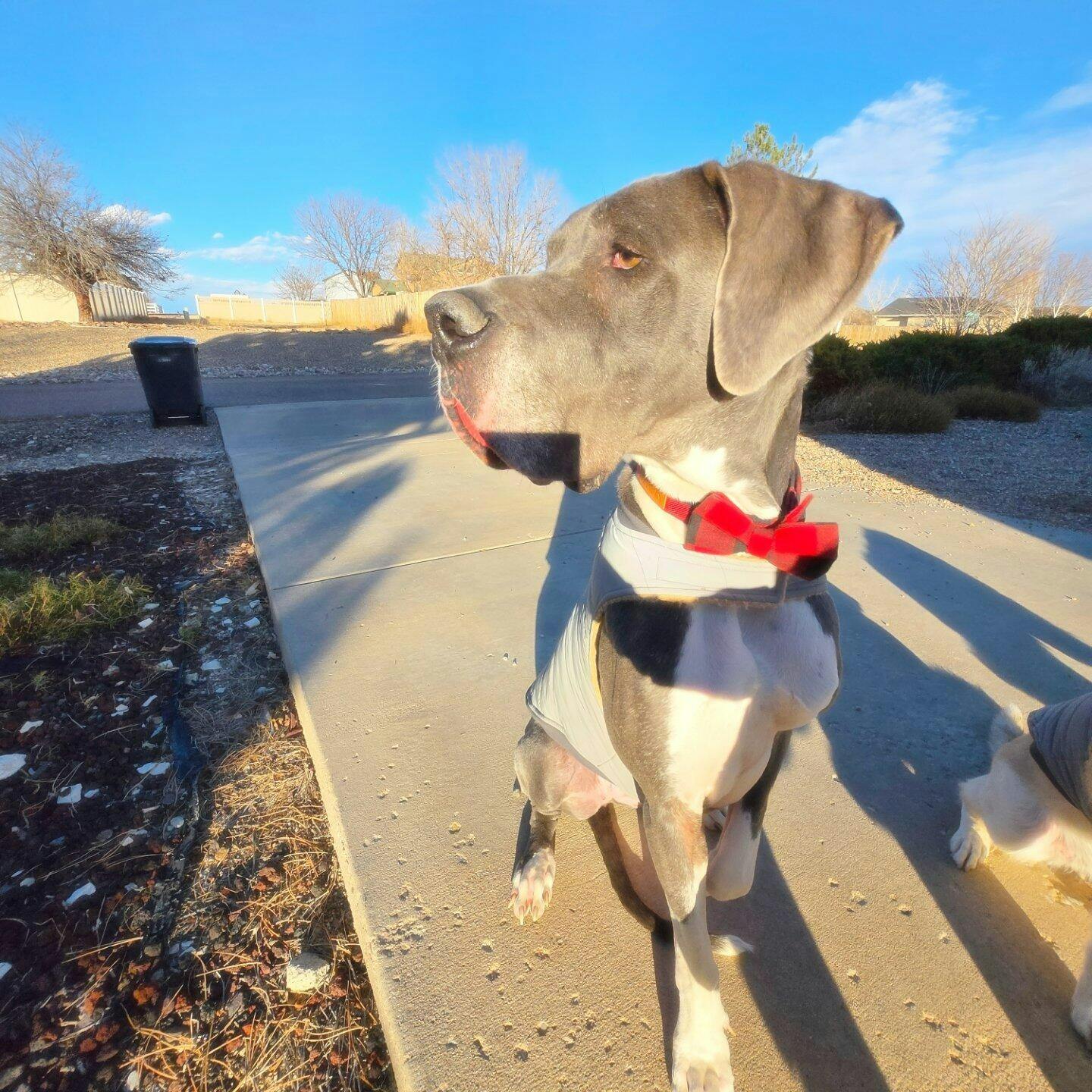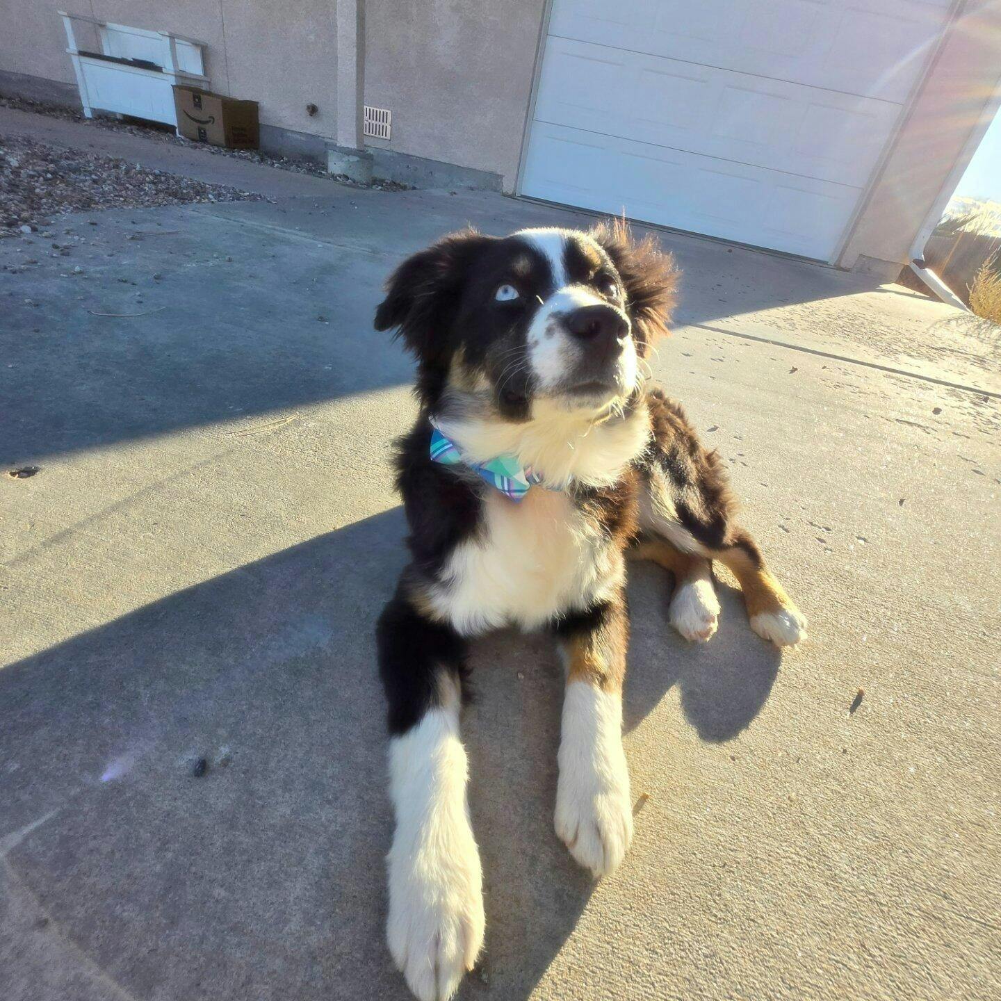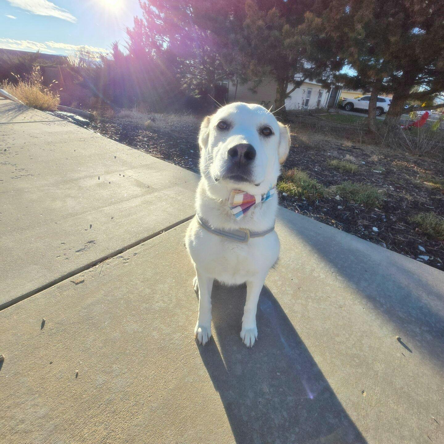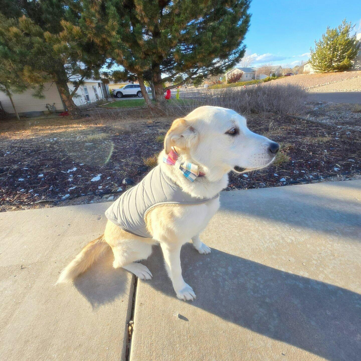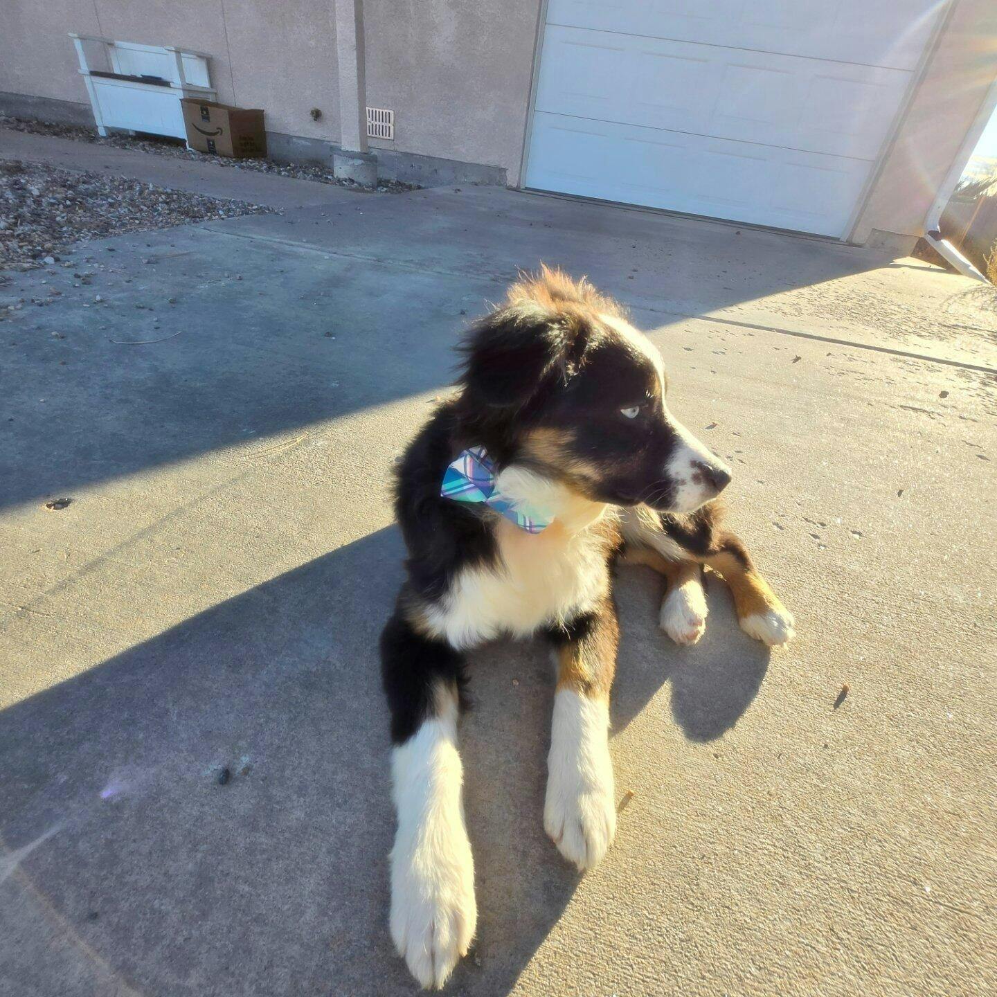 Pebbles loved her new color and leash but the bow tie she thought was a toy and has seen better days haha